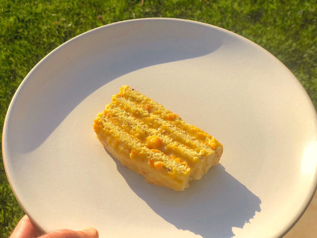 You can cut your sponge cake in thirds depending on how big you want your cake to be. Place the almond cake on the bottom and then spread a layer of the almond marmalade on top. Then place a piece of the almond sponge on top. Continue the process one more time until you have three layers. Chill for at least an hour if not more. Then slice a piece of almond cake and place it on a plate. Using a piping bag, pipe whipped cream on top of the cake. Finish with orange zest. Serve and enjoy!