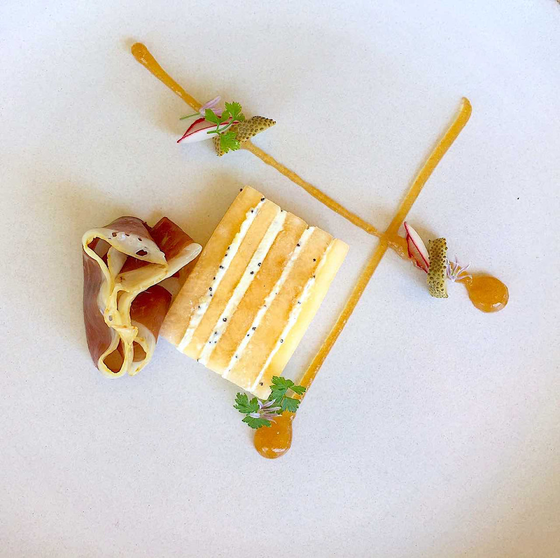 Duck prosciutto is absolutely delicious, and the product from gwen was no disappointment. The product was flawless and a perfect compliment to this classic pairing. I made a simple terrine with mascarpone, lemon, and poppy seeds with the melon. Instead of balsamic I pickled some strawberries and also made a gel with verjus. Here is the melon and prosciutto recipe I hope you enjoy it. `