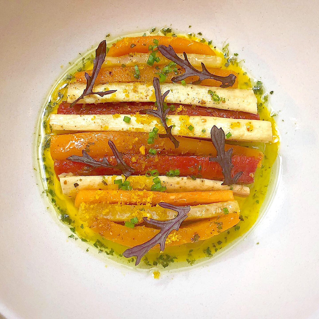 I wanted to concentrate primarily with carrots and parsnips, but I had a few other vegetables as well that I thought could also work well like honeynut squash and kohlrabi. I decided to add a little fresh winter fruit to the mix as well with persimmon. I seasoned everything with flavors of India and added a honeynut-turmeric butter sauce to round out the dish. Here is the recipe I hope you enjoy it! What you need for this recipe!