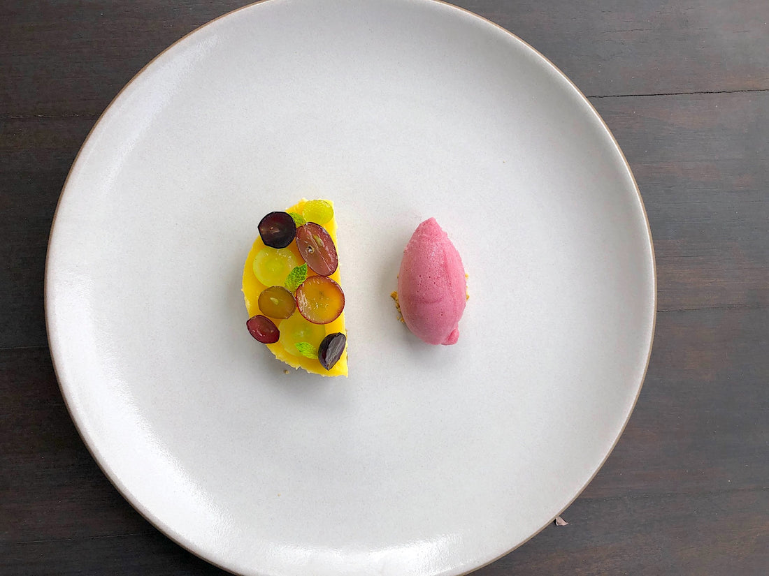 Burrata Cheesecake with Grape Sorbet and Lemon Curd