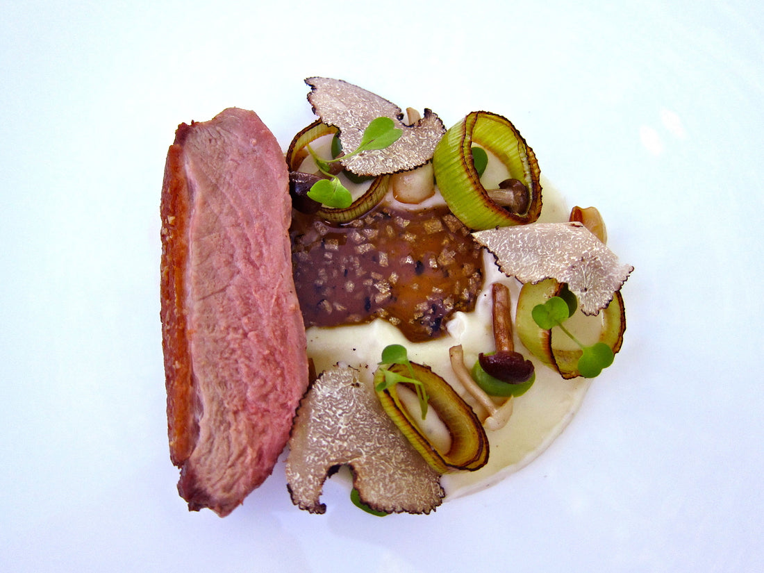 In a hot saucepan add butter, olive oil, and sliced leeks. Cook for one minute and then add your mushrooms. Try to keep the leeks intact for now. Cook for 5 minutes flipping the leeks over half way through. Add the fava beans and cook for another minute. Season with salt and pepper. Place two spoonfuls of mashed potato on the plate. Then add the diced truffles to the sauce. Place the leeks, mushrooms, and fava beans around the puree. Take the duck and slice in half lengthwise, place it next to the puree. Spoon in the sauce and top the dish off with a little fresh sliced black truffle. Serve and enjoy!