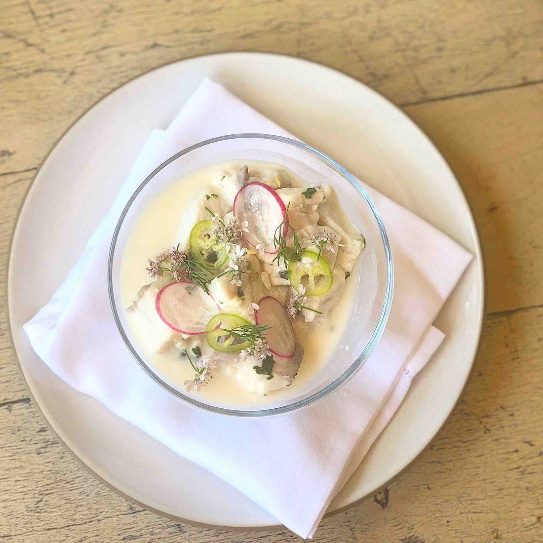 Place the juice of the all the citrus in a large bowl. Add diced Serranos, cilantro, and 2 tbsp of salt. Season all the fish really well with salt and place in the bowl. Make sure that the fish is completely covered in the citrus juice. Place in the refrigerator for at least 3 hours. Then after 3 hours you can add a can of coconut milk to the ceviche. Let it marinate for another 45 minutes and at this point the ceviche should be ready to serve, but it can sit for longer if need be. To serve, place some sliced Serranos, radishes, and cilantro flowers. Serve and enjoy!