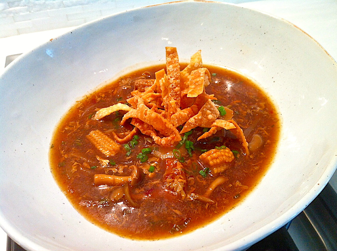 Place a fine mesh strainer over the soup and pour your eggs into the the strainer over the soup. Push the eggs through the strainer into the boiling soup. This will give you the egg texture in the soup that is the same as egg drop. Add your bamboo shoots, corn, water chestnuts, and sambal. Cook for 3 minutes and then add your corn starch. Cook for 5 more minutes and Season the soup the with a little salt if and sugar if needed. Finish the soup with green onions and fried wonton skins. Serve and enjoy!