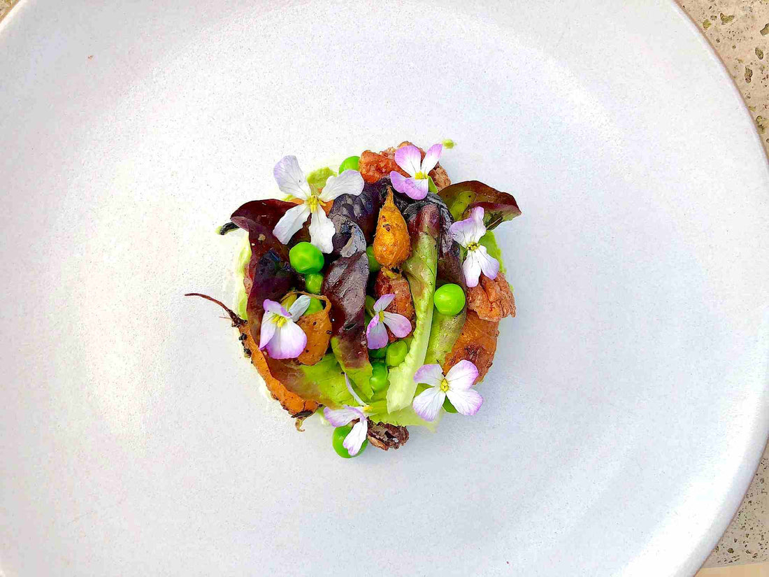 Take a large round cookie cutter and place on the plate. Add some of the jalapeno cheese and spread on the bottom of the plate. Then take the pea puree and spread evenly on top of the cheese. Take some of the carrots and place on top of the puree. Place the baby greens and peas in a small mixing bowl. Drizzle the white balsamic and olive oil on top of the greens and peas. Season with salt and pepper. Then add that on top of the carrots and puree. Add the candied pecans and more carrots and peas on top. Finish with radish flowers. Serve and enjoy!
