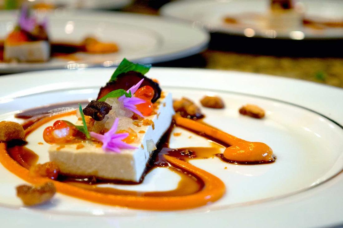 Finish the panna cotta with fresh Thai basil, mint, and garlic flowers. Finish the plate with a drizzle of soy glaze and roasted peanuts. Serve and enjoy!