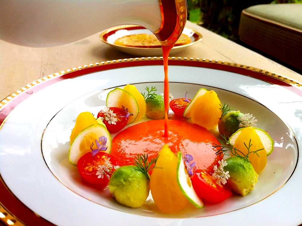 Gazpacho and it is a perfect, simple way to use some of your garden vegetables. That is exactly where this recipe comes from and anyone can make this recipe. I took a little extra time on my presentation to give it a more elegant look but obviously you can serve it any way you want.