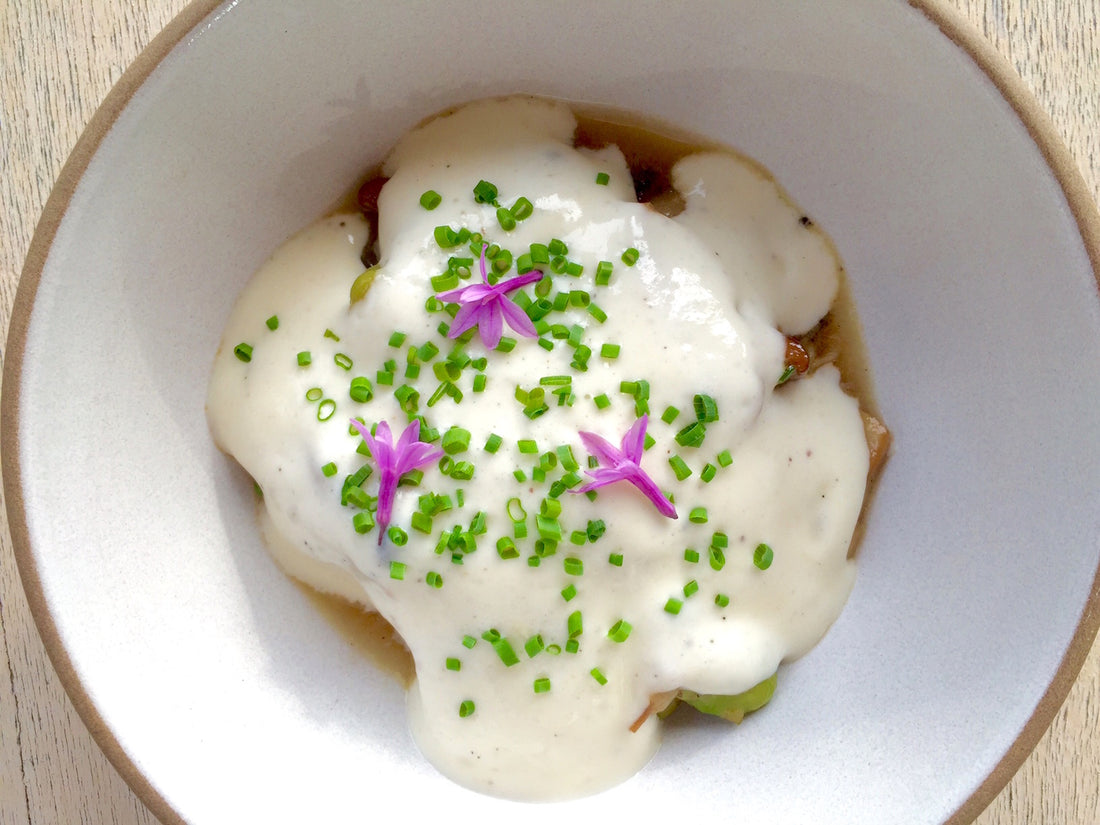 In a large saute pan add olive oil and 1 tbsp of butter along with porcini's. Cook the porcini's for 4 minutes and then add onions, beech mushrooms, and another tbsp of butter. Let that cook for 5 minutes until the mushroom and onions start to caramelize. Then add 4 oz of the jujube tea to the pan along with a splash of vinegar. Let it cook for another 3-4 minutes until there is just a little broth left in the pan. Then finish with the rest of the butter, fava beans, salt, pepper, chives, and maybe another splash of vinegar. Then add a few spoonfuls of the ragu to a serving bowl. Then ladle another 2 oz of tea on top of the ragu. Then take your canister with your comte bechemel and foam cheese foam on top of it all. Finish with chives and garlic flowers. Serve and enjoy!