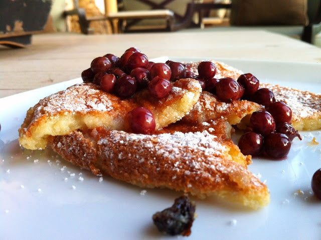 and dinner was fabulous as you would expect. Wolfgang was in the kitchen that night and giving us the VIP treatment but the dish that really stuck out in my mind was dessert, the Kaiserschmarrn. They cooked and presented these wonderful light Austrian pancakes, table side, in these crepe/souffle like pans. They cut them in half and served them topped with strawberries and cream. They were perfectly sweet, light, fluffy, and custardy all at the same time. In my mind it was the perfect dessert, I really loved it. He gave us a signed cooked book, we took a few more photos, and we said good night. I remember that wonderful dessert but had forgotten to try and make it up until a few weeks ago. As usual I try to put little changes on recipes because I don't like flat out "stealing" recipes but sometimes there are classics that you need to use.