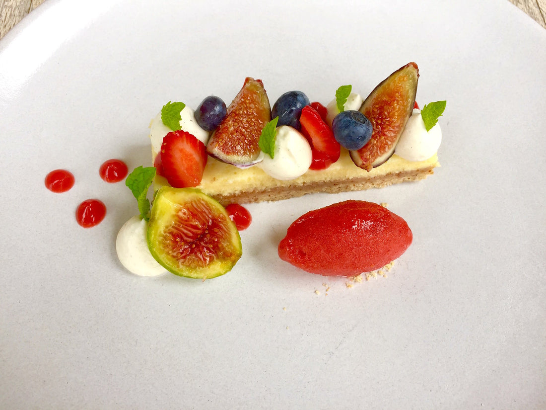 Take the cheesecake and slice into rectangular pieces. Then alternate the fruit on top of each slice. Pipe a little whipped cream on top as well. Place the slice on the plate. Add a few drops of strawberry gel. Then take a scoop of the strawberry sorbet. Finish with mint, serve and enjoy the best cheesecake you have ever had!