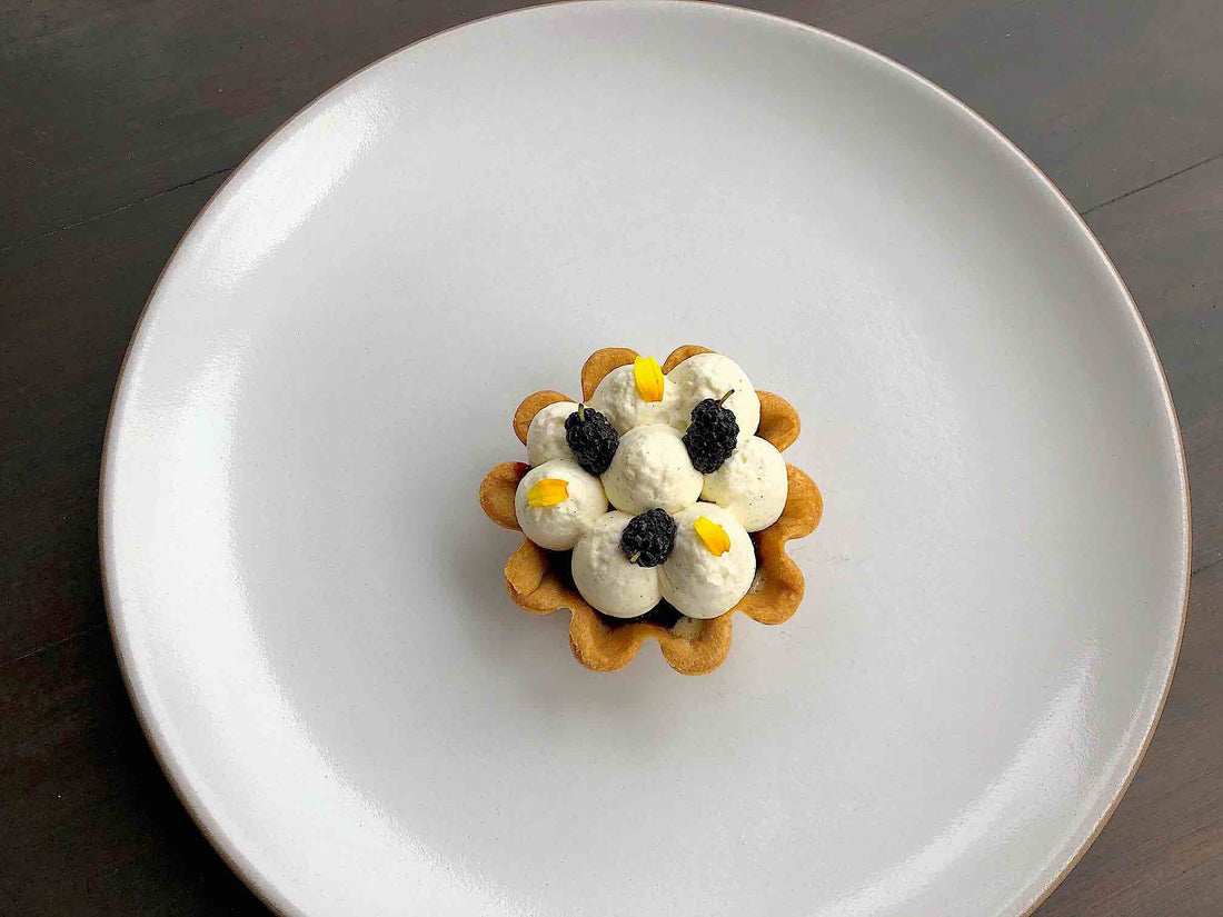 Take whipped cream and place in a piping bag and pipe little dots on the tarts. Add some fresh mulberries to the top with any edible flowers you desire. Serve and enjoy!