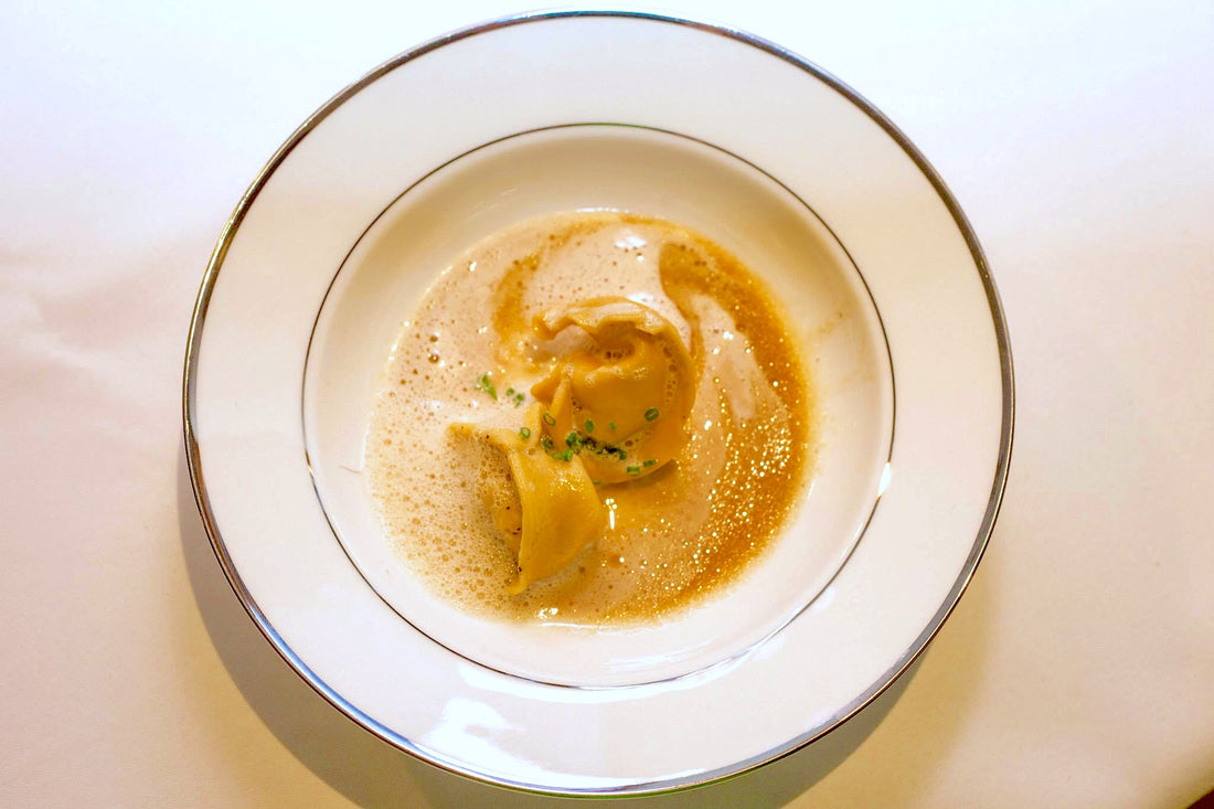 Take your rested dough and cut in half. Wrap the one half and use the other half. Roll the half you are using with a rolling pin until you get it thin enough to be placed in your pasta machine. Working on one level at a time, roll your past dough through the pasta machine working it all the way down. Then fold it up all together again and repeat the process at least one more time if not 2 more times. On the third time working the pasta dough down until the second to last dial or level on the pasta machine. Using a big ring mold cut out large circles in the dough. Then take out your filling and place a large spoonful of mushroom mix in the center of your circle. Take a small brush dipped in either water or egg and brush half of your circle (round pasta) with it. Fold the pasta over the mushroom filling so now you should have something that looks like an empanada or in Italian this shape of pasta would be called agnolotti. Once you have all of these agnolotti shapes (half moon, empanada) take the right corner of pasta and add a touch of water with your finger. Then take the left corner and fold it over the right corner pinching the ends so they stick. This should give you the tortellini shape. Repeat until all the mushroom mix is gone. Place the pasta on a sheet tray that is lined with parchment dusted with flour to prevent sticking.