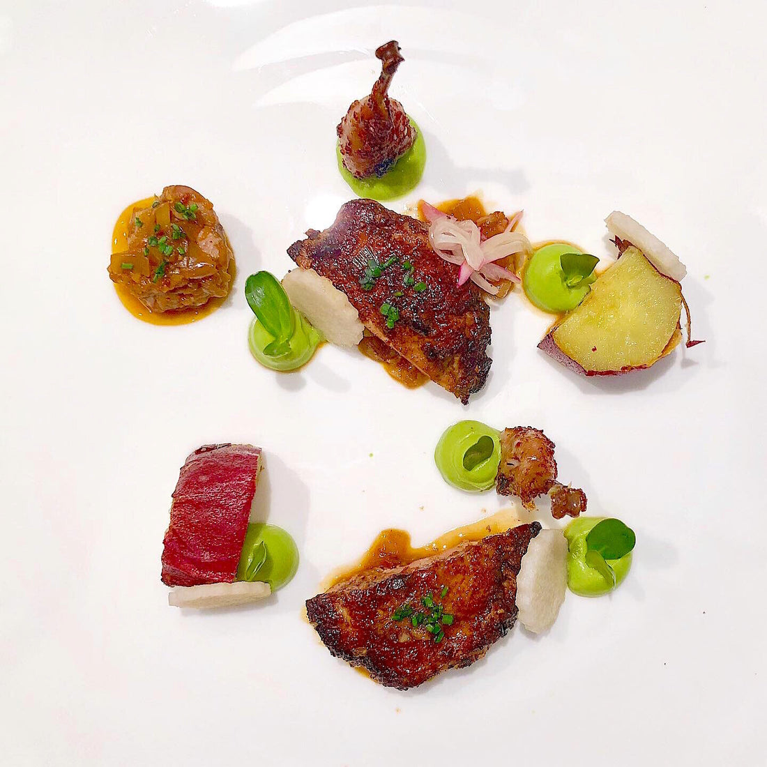 This recipe was a huge hit with Jp. I wanted to make a XO sauce to go with the quail but one without shellfish. Usually the XO sauce consists of dried scallops and shrimp among other ingredients. I wanted make the XO sauce with a similar flavor profile of fish and add some meat to give it a complex deep flavor. The results were absolutely delicious! I added some pear, sweet potato, and broccoli puree to the dish and rounded it all out with a little pickled onions. Here is the recipe I hope you enjoy it!