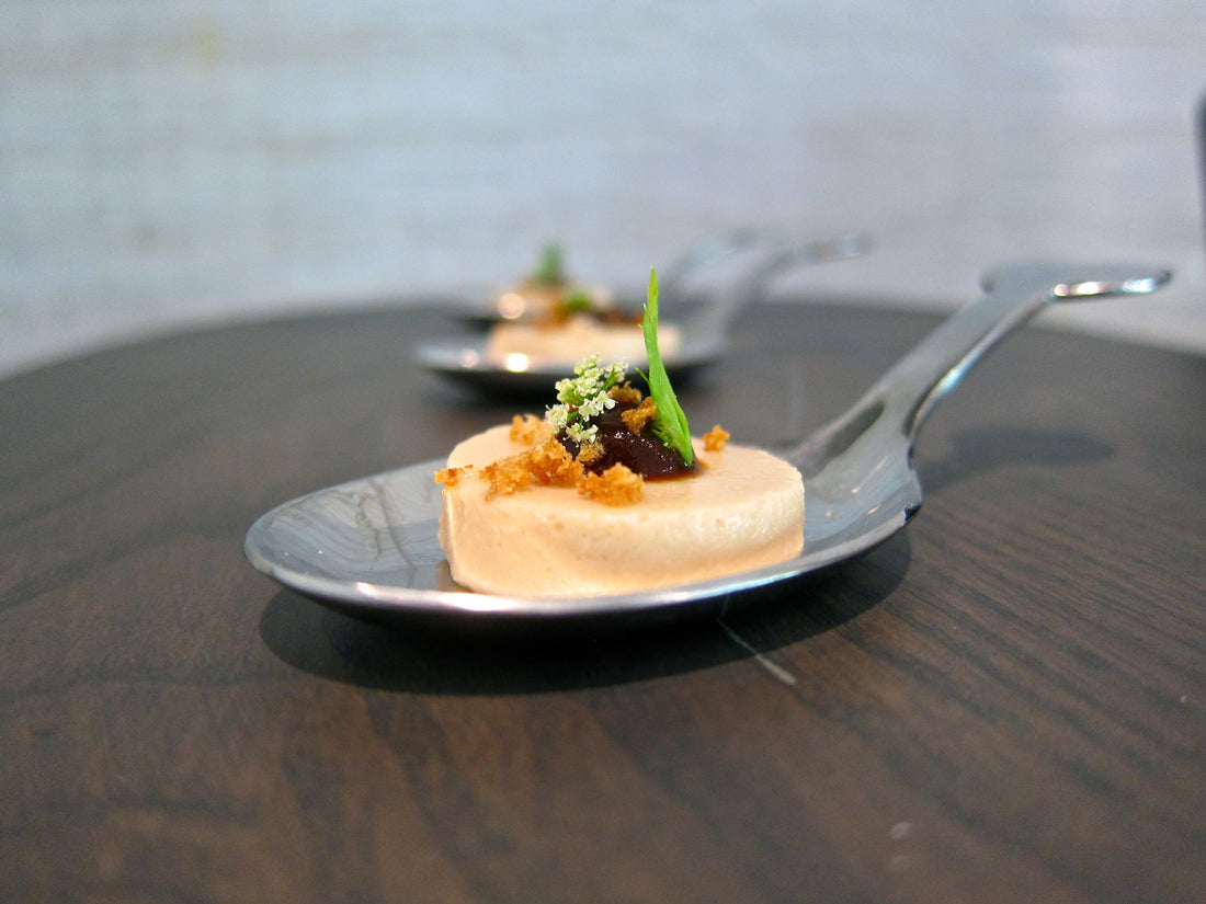 Take a small round mold and cut out small rounds of the panna cotta. Then place on a spoon or on top of your cracker. Take a small dollop of black garlic gel in the center of the panna cotta. Finish with a little minced celery, fried celery root, celery leaves and flowers. Serve and enjoy!