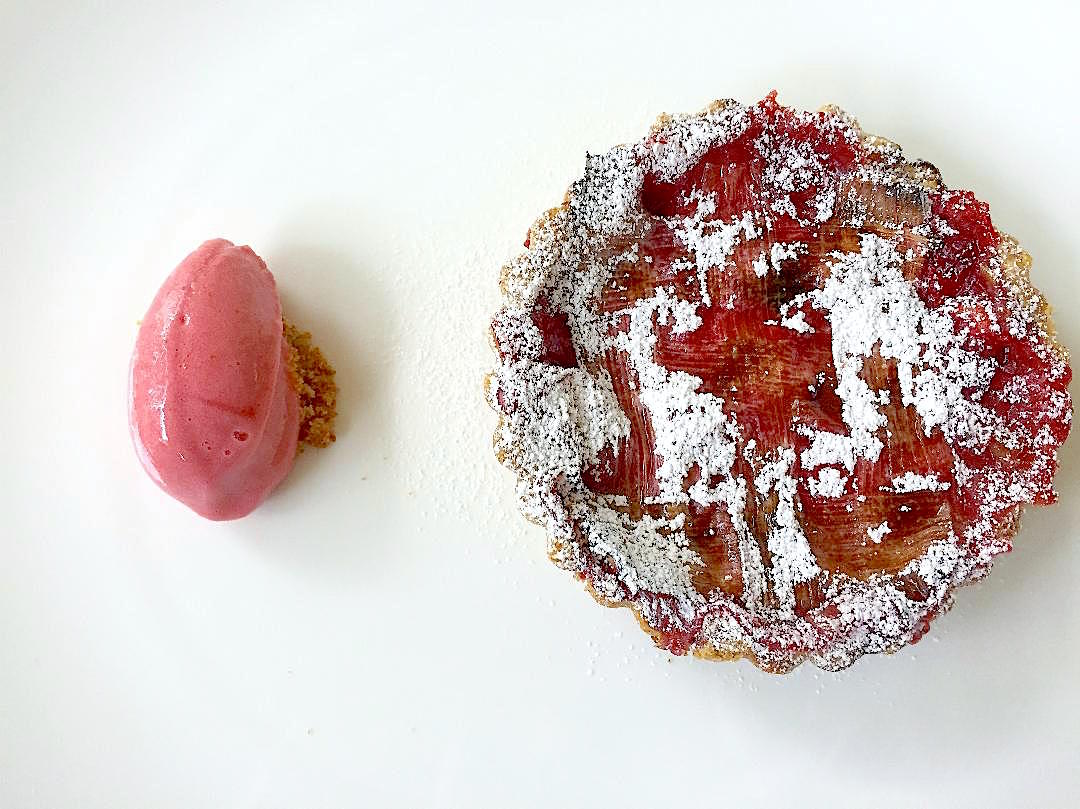 Take some powdered sugar and sprinkle on top of the tart. Take a little crushed up cookie like (biscotti, graham cracker) and place on the plate. Take a scoop of the rhubarb sorbet and place on top of the crushed cookie (this helps anchor the sorbet so it doesn’t slide all of the plate). Serve and enjoy!