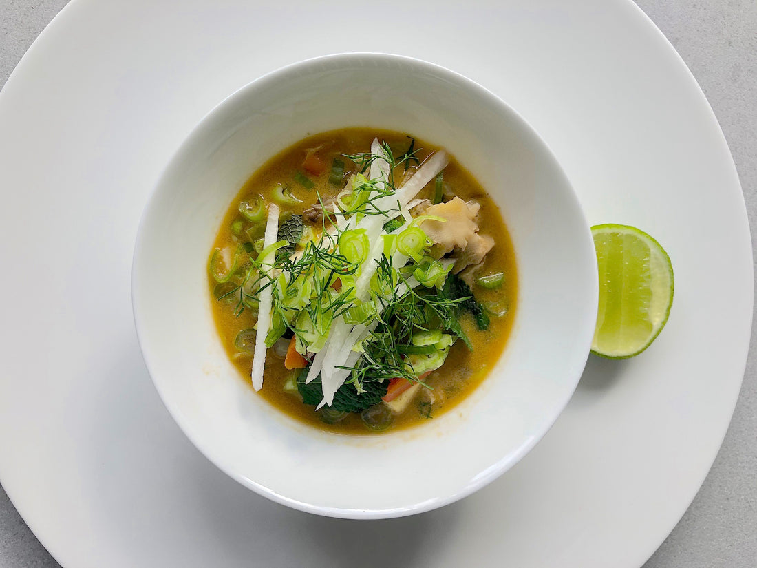 Season everything with salt if need be and finish the soup with cilantro and mint. Pour into a bowl and top the soup with julienned daikon radish, cilantro, green onions, and a slice of lime. Serve and enjoy!