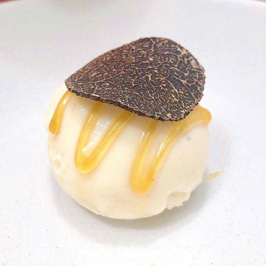 Take a scoop of the sorbet and place in a bowl. Drizzle honey on top of the scoop. Slice one slice of black truffle. Serve and enjoy!